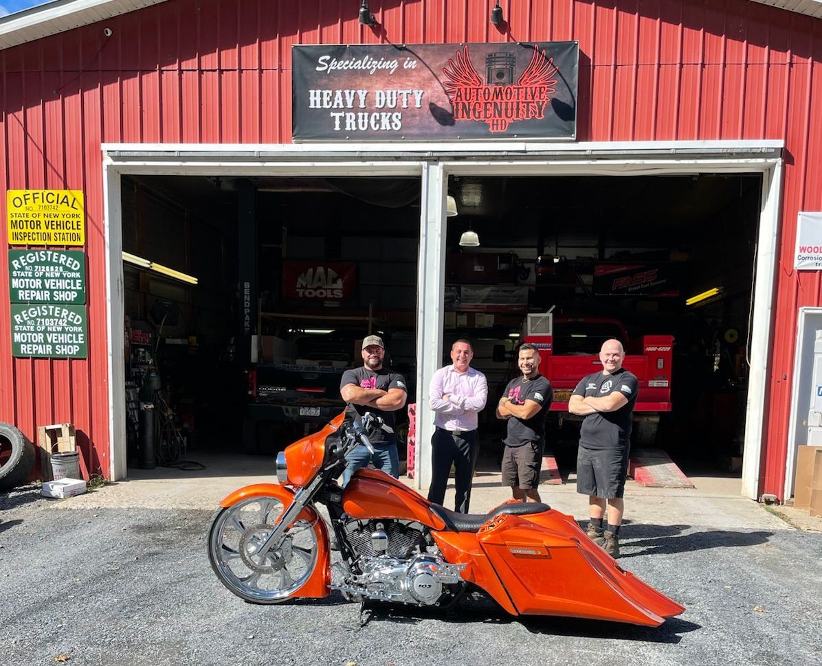 Edin V. Guzman (second from right), Jeff Powers (left), and Ryan Derry (right) are the co-founders of Automotive Ingenuity HD, a Unionville-based auto and heavy-duty repair shop rooted in trust and community. (Image: courtesy of Automotive Ingenuity HD)